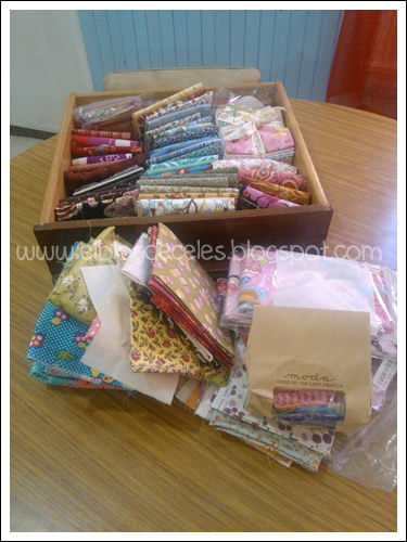 Una vez que tuve todos los FQ doblados de la medida que necesitaba (cuidar que cada pieza no exceda el alto del cajón, para que después abra y cierre con facilidad) los dividí por color, los ordené en el cajón, y como sobraba espacio agregué un bundle de Moda que está esperando convertirse en un cubrecama de verano para Maite, y una scrap bag diviiiiiiiina, también de Moda, que me compré hace unos días :)