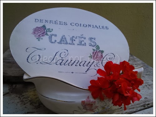Por supuesto la madera de base podría haber estado mucho más trabajada, con esos decapados preciosos que veo en algunos blogs, después una pátina, un montón de habilidades de las que carezco totalmente por el momento. Gracias que tuve una base blanca y luego un poco de barniz. Pero estoy contentísima con el resultado, no dejo de mirarlo, no puedo creer haber sido capaz de reproducir algo que veo salir de algunas manos que sí fueron dotadas para estos menesteres. Me quedó pendiente conseguir unas patitas de esas que se usaban antes para parar los platitos de adornos ¿las seguirán fabricando? Busqué unas que tenía mi mamá pero parece que se rompieron hace tiempo, voy a ir a algún bazar grande a ver si no me sacan corriendo.