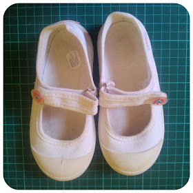 Este fin de semana no fue tan veraniego como los anteriores, más bien la lluvia nos obligó a quedarnos adentro. Y eso significa buscar con qué entretener a la pequeña fiera, para que todos estemos tranquilos :) Domingo a la tarde, marido intentando ver el Super Bowl, hija queriendo ver dibujitos (y en casa hay un solo televisor), así que mamá salió a mediar antes de que empezaran las peleas. Me acordé de unos zapatitos (mejor dicho, unas guillerminas de lona) que Maite tuvo que usar para el acto de fin de año del jardín. Son blancas, así que las dos o tres veces que se las puso después, duraron muy poco limpias y en buenas condiciones (tampoco le podemos pedir milagros a una nena de 3 años, no?) Así quedaron después del último lavado: