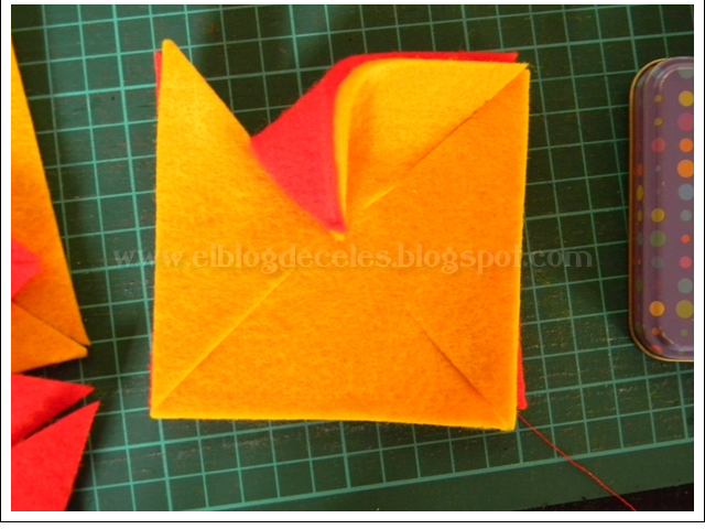 Superponer los cuadrados y sujetarlos con una puntadita en el centro. Lo ideal es usar hilo del color del cuadrado que va a quedar hacia abajo (rojo en mi caso) para que quede prolijo y casi no se noten las puntadas. Coser 4 puntas alternadamente al centro del trabajo (en la foto se ve la primera) y al terminar las 4, molinito listo! Sólo queda decorarlo con algo en el medio, si quieren, y ponerle una cintita atrás para poder colgarlo del arbolito o de un picaporte, y ya está terminado.